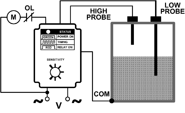 Controls Level of Conductive Liquids in Pump Up (Fill) or Pump Down (Drain) Applications Probe is Pulsed with DC Voltage to Prevent Electrolysis Two Adjustable Sensitivity Ranges Input Voltages of 24, 120 & 240V