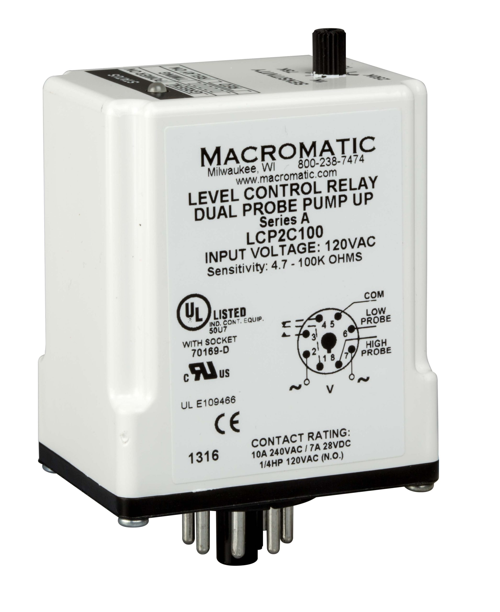 LCP Series Liquid Level Control Relays detect and control levels of conductive liquids (tap water, seawater, sewage, chemical solutions, coffee, ice cream, etc.)in single probe pump up or pump down applications. The conductive properties of the liquid complete a circuit between a probe and common when the liquid comesin contact with both. These relays compare the value of the measured resistance between probes with the setpoint of the adjustable potentiometer provided on the product. The output of the relay is used to control pumps, solenoids or valves to lower, raise or maintain the level of the liquid in the tank. Probes are pulsed with a DC voltage to prevent potential electroplating issues. A built-in time delay prevents rapid cycling.