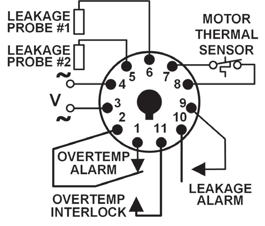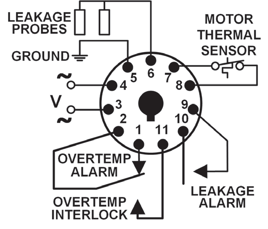 Two wires from the relay are connected to a N.C. thermal switch in the windings of the pump motor to monitor for overheating. A low-voltage DC signal is applied to check the status of the thermal switch. Two additional wires are connected to a single or dual resistance-sensing probe and the grounded motor housing, or across two probes to monitor for seal leakage using a low-voltage DC signal. These products have isolated output contact relays, one for over temperature and one for seal leakage. The over temperature set-point is fixed at 5K ohms. Two adjustable seal leakage sensitivity ranges are available: 4.7K-100K ohms and 1K-250K ohms.