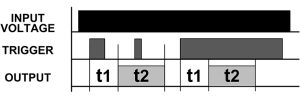 Upon application of input voltage, the time delay (t1) begins. At the end of the time delay (t1), the output is energized and remains in that condition for the time delay (t2). At the end of this time delay (t2), the output is de-energized. Input voltage must be removed to reset the time delay relay.