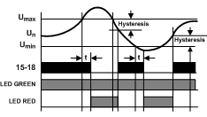 As long as the monitored voltage (Un) remains within the OVER (Umax) & UNDER (Umin) voltage settings, the internal relay stays energized. If the monitored voltage falls outside this range, the relay will drop-out. The Umax dial sets the upper limit per the Overvoltage range of the product. The Umin dial sets the lower limit at 30-95% of the upper setting. This product has an adjustable time delay on drop-out of 0.1-10 seconds (t) to prevent nuisance tripping.